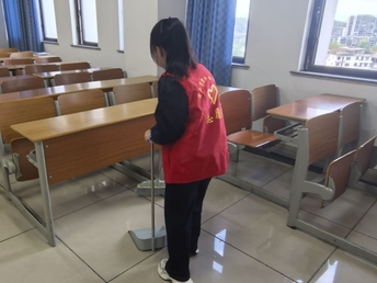 上午第二节课下课铃声刚落,志愿者们便携带垃圾袋、抹布、小扫帚等工具,迅速前往指定教室开展清扫。新生志愿者们分工明确、配合默契:有的弯腰捡拾地面纸屑、果皮,将垃圾分类投入垃圾桶;有的用抹布仔细擦拭桌面笔迹、讲台粉笔灰;还有的逐一规整散乱的课桌椅,确保教室布局整齐有序。若当天为该教室最后一节课,志愿者还会额外检查电灯、空调是否关闭,门窗是否关好,用细节保障教室安全。除了常规清扫,志愿者们还会留意同学们的需求,比如帮大家把忘记带走的书本放到讲台上以便认领,或是在黑板角落写下温馨提示,提醒大家爱护教室卫生。