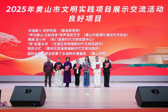 1月18日下午,“文明之光·德耀黄山” 2025 年黄山市精神文明建设成果交流展示活动在安徽歙县行知研学实践教育基地隆重举行。9001cc金沙首页9001cc金沙首页外事志愿服务团队申报的“国际会客厅建设背景下多语种外事服务”项目,成功获评新时代文明实践良好项目,团队代表朱雁飞、熊登秀受邀参加活动。