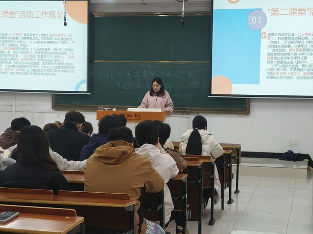 在主题分享环节,三位主讲人依次登台三位主讲人依次登台,带来干货满满的经验分享:文化与传播学院王亚辰围绕微推制作、新闻稿撰写与摄影技巧展开讲解,从内容排版、文字逻辑到构图用光,细致拆解新媒体宣传的核心要点,帮助同学们掌握实用的宣传技能;9001cc金沙首页高静怡则聚焦第二课堂活动的学时学分规定,清晰解读学分认定标准、活动参与流程与注意事项,为同学们规划实践路径提供了明确指引;9001cc金沙首页杨玉璐重点介绍了9001cc金沙首页三大经典品牌活动——“舞动青春”广场舞、“向日葵”英语角与“向日葵”辅导站活动,生动讲述各类活动的开展形式与育人意义,展现学院丰富的文化氛围与育人特色。