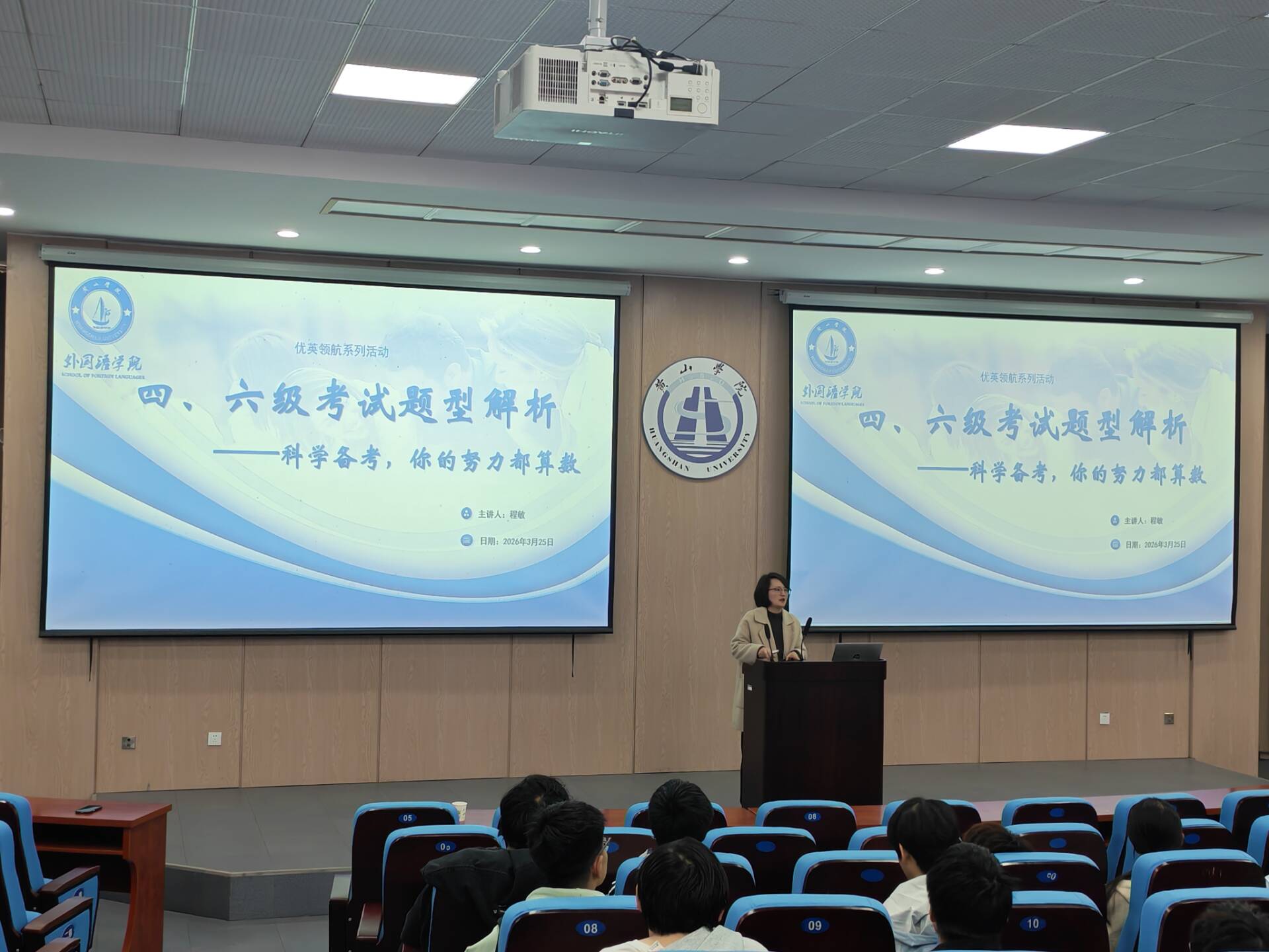 与此同时,为将辅导服务进一步下沉至学生身边,该教研室选派骨干教师程敏继续深入二级学院,首站于3月25日走进机电学院,开展大学英语四、六级专题辅导讲座。程敏老师结合工科学生的英语学习特点,从听力、阅读、翻译、写作四大模块入手,逐一剖析常见失分点与高效提分策略,并借助真题案例进行现场演练。讲座现场互动频繁、气氛活跃,同学们纷纷表示“干货满满”,对后续备考有了更清晰的规划。